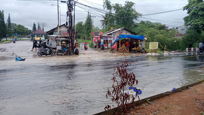 BERITASUKABUMI.ID – Jalan protokol Sukabumi-Bogor tepatnya di Perapatan Simpang Gang Ojek Sindangpalay, Desa Tenjoayu, Kecamatan Cicurug, Kabupaten Sukabumi sering digenangi air akibat luapan air selokan ketika hujan deras.