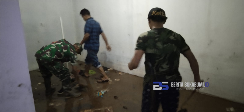 Babinsa Desa Jayabakti, Sertu Dadan Subandi bersihkan rumah yang digenangi air. Foto: Berita Sukabumi