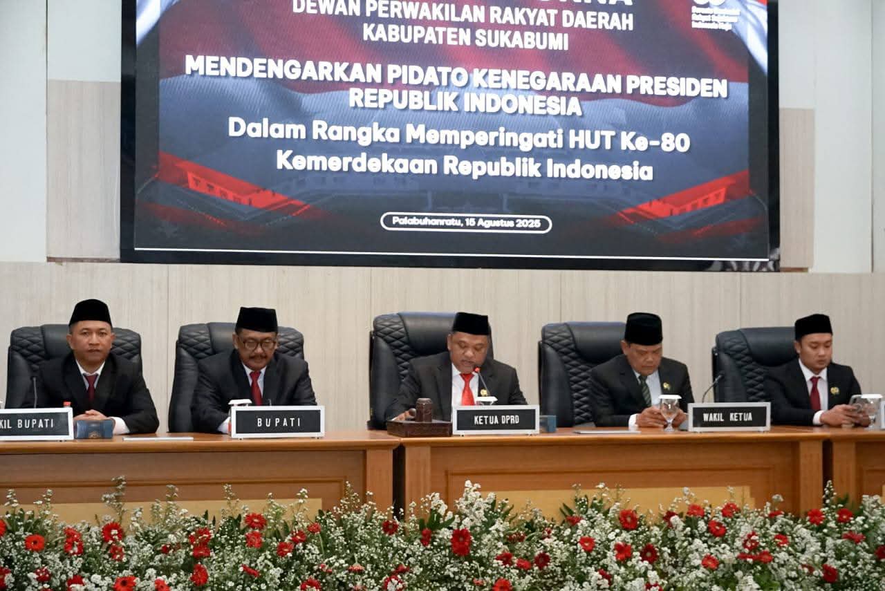 BERITASUKABUMI.ID – Pemerintah Kabupaten Sukabumi bersama DPRD mendengarkan pidato kenegaraan Presiden Republik Indonesia Prabowo Subianto dalam rangka peringatan HUT ke-80 Kemerdekaan RI. Pidato tersebut disaksikan melalui siaran televisi di Ruang Rapat Paripurna DPRD Kabupaten Sukabumi, Jumat (15/8/2025).