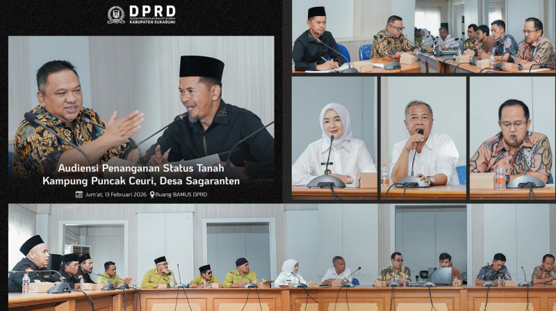 BERITASUKABUMI.ID – Ketua DPRD Kabupaten Sukabumi, Budi Azhar Mutawali, didampingi Ketua Komisi I DPRD, Iwan Ridwan, telah memimpin audiensi terkait penyelesaian status tanah di Kampung Puncak Ceuri, Desa Sagaranten, Kecamatan Sagaranten. Kegiatan yang berlangsung pada Jumat (13/2/2026) di Ruang BAMUS DPRD Kabupaten Sukabumi menghadirkan berbagai pemangku kepentingan untuk mencari solusi konkret atas permasalahan lahan di wilayah tersebut.