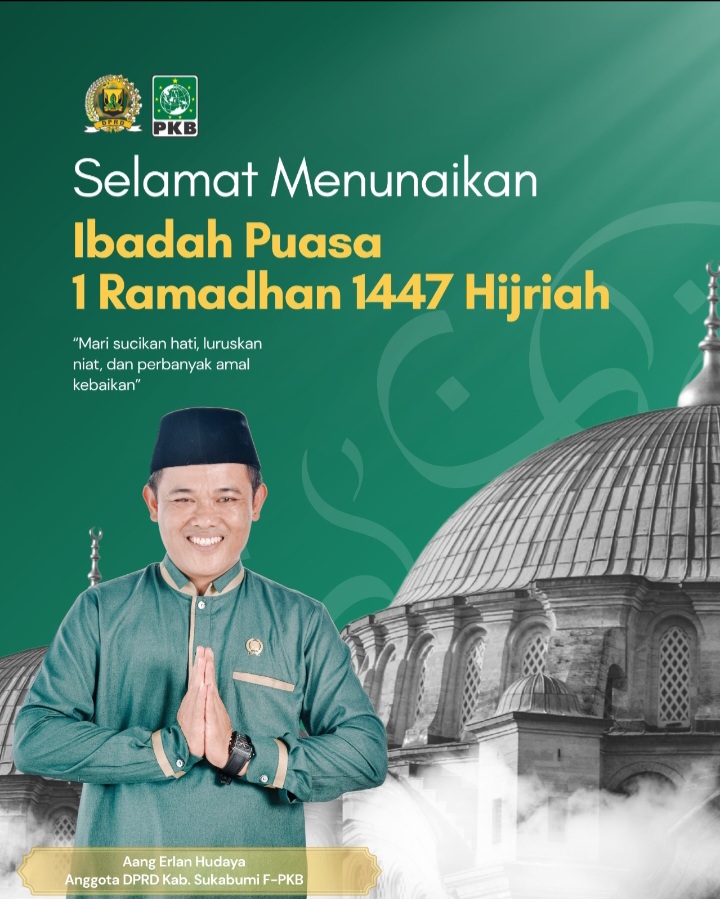 BERITASUKABUMI.ID – Anggota Dewan Perwakilan Rakyat Daerah (DPRD) Kabupaten Sukabumi dari Fraksi Partai Kebangkitan Bangsa (PKB), Aang Erlan Hudaya, mengucapkan selamat menyambut bulan suci Ramadhan bagi seluruh umat muslim di wilayah Kabupaten Sukabumi dan seantero nusantara.