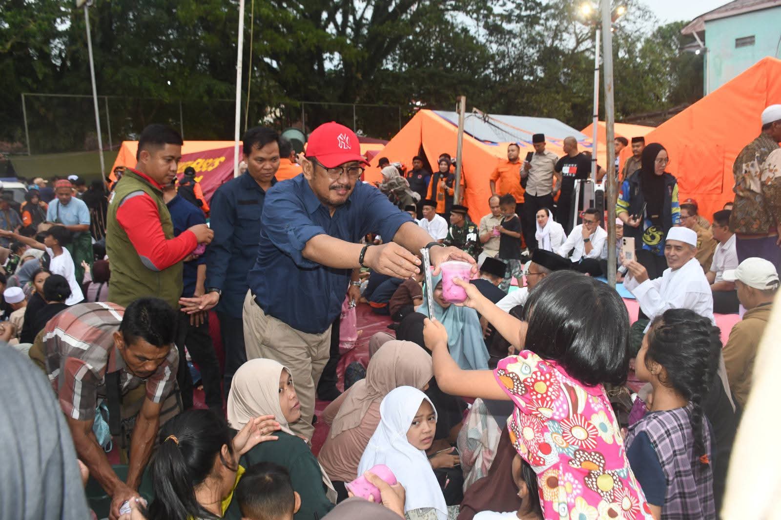 Dalam kesempatan tersebut, Bupati H Asep Japar secara pribadi menyapa setiap penyintas bencana. Ia terlihat akrab berbincang dengan berbagai kalangan warga, menyapa anak-anak dengan penuh kasih sayang, bahkan turut membantu membagikan takjil kepada mereka. Kehadiran pemimpin daerah tersebut memberikan semangat baru bagi para penghuni pengungsian yang masih dalam masa penyesuaian.