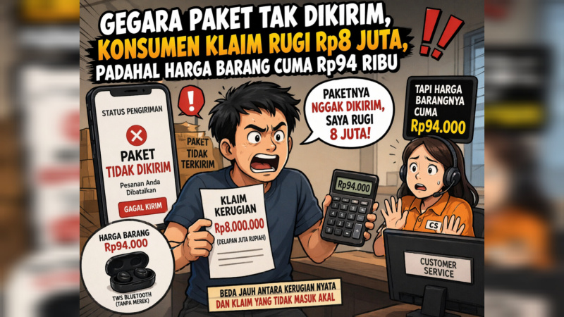 “Kami heran, bagaimana bisa barang yang harganya cuma Rp94 ribu, tiba-tiba dituntut rugi sampai Rp8 juta? Ini kan jauh melampaui nilai aslinya. Apa yang membuat nilainya jadi semahal itu? Padahal paketnya saja belum sampai diterima,” ujar salah satu pihak yang mengetahui kronologi kejadian, Yudi Sekjen AJC, Minggu (19/04/26).